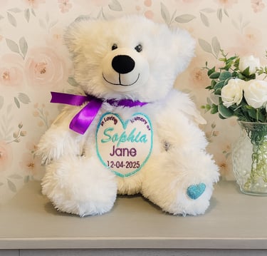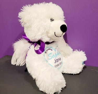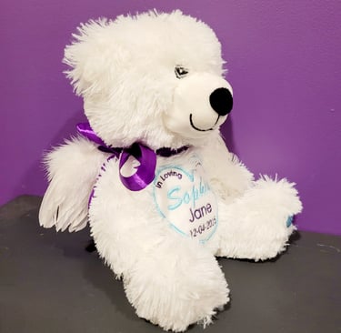 At Stitch & Snuggle Co., we create soft, handcrafted angel bears to honour the memory of a child. Each bear features delicate wings and is embroidered with “In Loving Memory of”, the child’s name, and date.